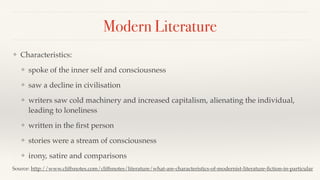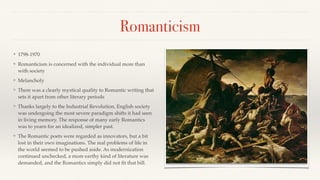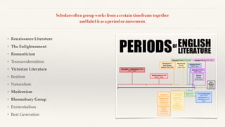 - 2. Scholars often group works from a certain timeframe together and label it as a period or movement. ❖ Renaissance Literature ❖ The Enlightenment ❖ Romanticism ❖ Transcendentalism ❖ Victorian Literature ❖ Realism ❖ Naturalism ❖ Modernism ❖ Bloomsbury Group ❖ Existentialism ❖ Beat Generation