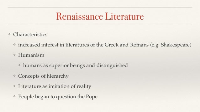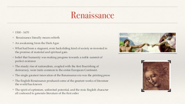 - 3. Renaissance ❖ 1500 - 1670 ❖ Renaissance literally means rebirth ❖ An awakening from the Dark Ages ❖ What had been a stagnant, even backsliding kind of society re-invested in the promise of material and spiritual gain. ❖ belief that humanity was making progress towards a noble summit of perfect existence ❖ The steady rise of nationalism, coupled with the first flourishing of democracy, were traits common to the entire European Continent. ❖ The single greatest innovation of the Renaissance era was the printing press ❖ The English Renaissance produced some of the greatest works of literature the world has known ❖ The spirit of optimism, unlimited potential, and the stoic English character all coalesced to generate literature of the first order